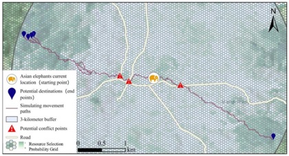 该框架不仅能够回溯象群历史移动轨迹,还可通过筛选高资源选择概率的区域作为潜在终点,预测象群未来移动方向,为保护区管理人员提供实时决策支持。例如,当监测到象群接近村落时,系统可快速模拟其最可能的行进路径,辅助提前部署防护措施,有效降低人象冲突风险。