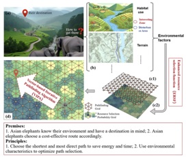 随着亚洲象栖息地与人类活动区域重叠度增加,准确预测象群移动路径成为冲突防控的关键。然而,现有模型大多依赖高频GPS数据,难以适用于象群等难以持续追踪的大型动物。ERSF-VIPA框架融合增强型资源选择函数与向量网络迭代路径搜索算法,仅凭起止点位置与历史出现点数据,即可模拟象群在复杂地形中的移动路径。